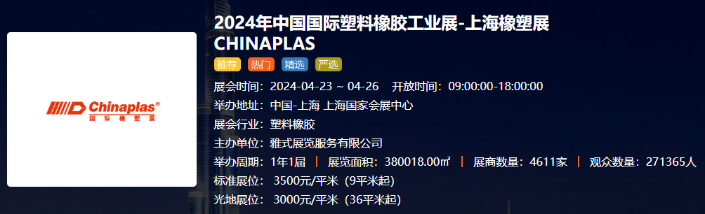 中国国际橡塑工业展览会(CHINAPLAS)创办于1983年,是全球关注的年度橡塑盛会——CHINAPLAS国际橡塑展览会。汇聚创新橡塑解决方案和行业信息,是激发和发掘时代机遇的“金钥匙”,也是企业采购、技术发布和交流的枢纽。